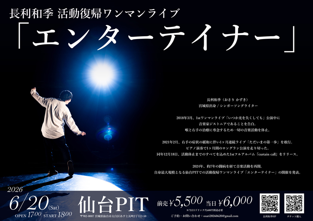 長利和季活動復帰ワンマンライブ「エンターテイナー」 LIVE 2026/06/20(土) 宮城 仙台PIT OPEN 17:00 / START 18:00 TICKET 前売り¥5,500 / 当日¥6,000(+1drink) 〈出演〉 長利和季 チケットのご購入はこちら URLをコピーする 報告する